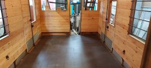 With the heating installation completed, the flooring could be put in. The Independent Competent Person (I.C.P.), appointed to oversee the restoration of the vehicle, approved the various flooring layers to ensure full fire and safety compliance. The finish was brown Marmoleum (lino) in the luggage compartment with green in the large saloon and a contemporary style carpet in the small saloon