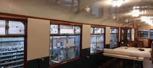 Other achievements since the railcar returned have been the servicing and temporary re-fitting of the six, yes six, prop shafts. Final fit is awaiting the delivery of the correct Independent Competent Person (I.C.P.) approved components. In addition, the ceiling installation has commenced having also received I.C.P. approval, with the small saloon and vestibule having been completed, as far as possible and it looks very appealing in its ivory finish.