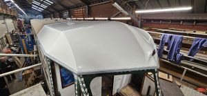 The restoration team has made excellent progress, working hard to make the railcar watertight by permanently fitting the roof sheets, installing the saloon glazing and window surrounds and working on the cab end.