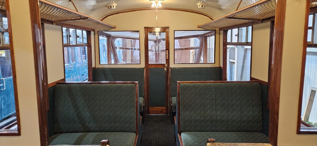 The seats, which were in an inappropriate leatherette material, were recovered in an original moquette, sourced from a manufacturer who could supply the genuine material and upholstered by a specialist contractor to comply with modern safety standards